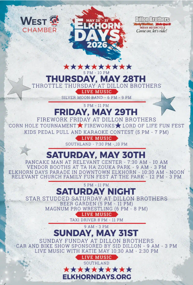 Enjoy a wide variety of activities over this 4-day festival, including the area’s largest parade, lots of live music, vendor booths, kids and family activities, Corn Hole, beer garden, fireworks, car show, and so much more! Fireworks Friday May 29th. Parade Saturday May 30th 10:30-Noon