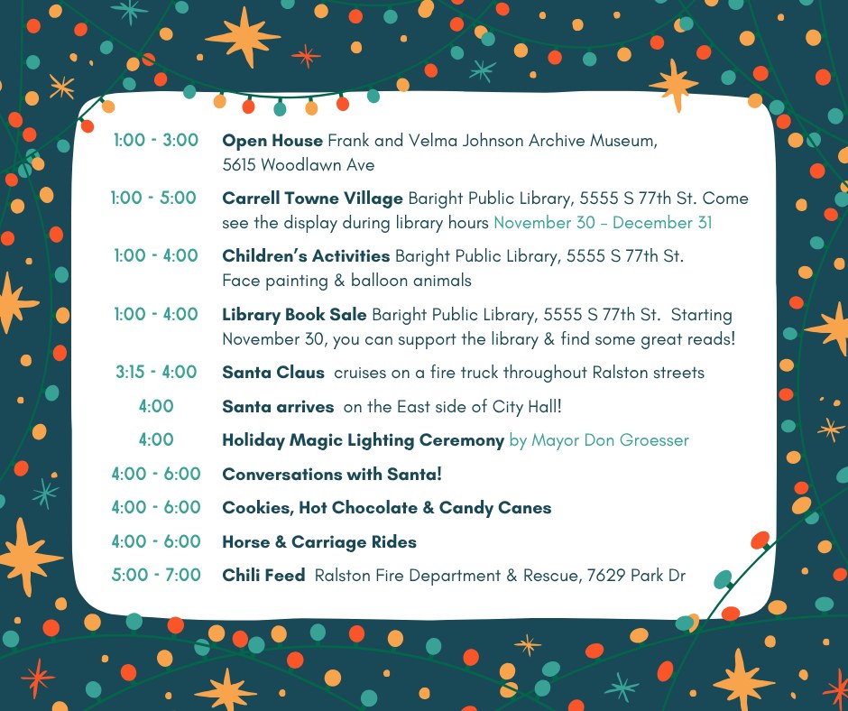 Join Mayor Groesser as we light up downtown and get into the holiday spirit! Bring your family out to enjoy a Ralston tradition! Visit Santa and enjoy FREE carriage rides, children’s activities, hot chocolate, and cookies.
